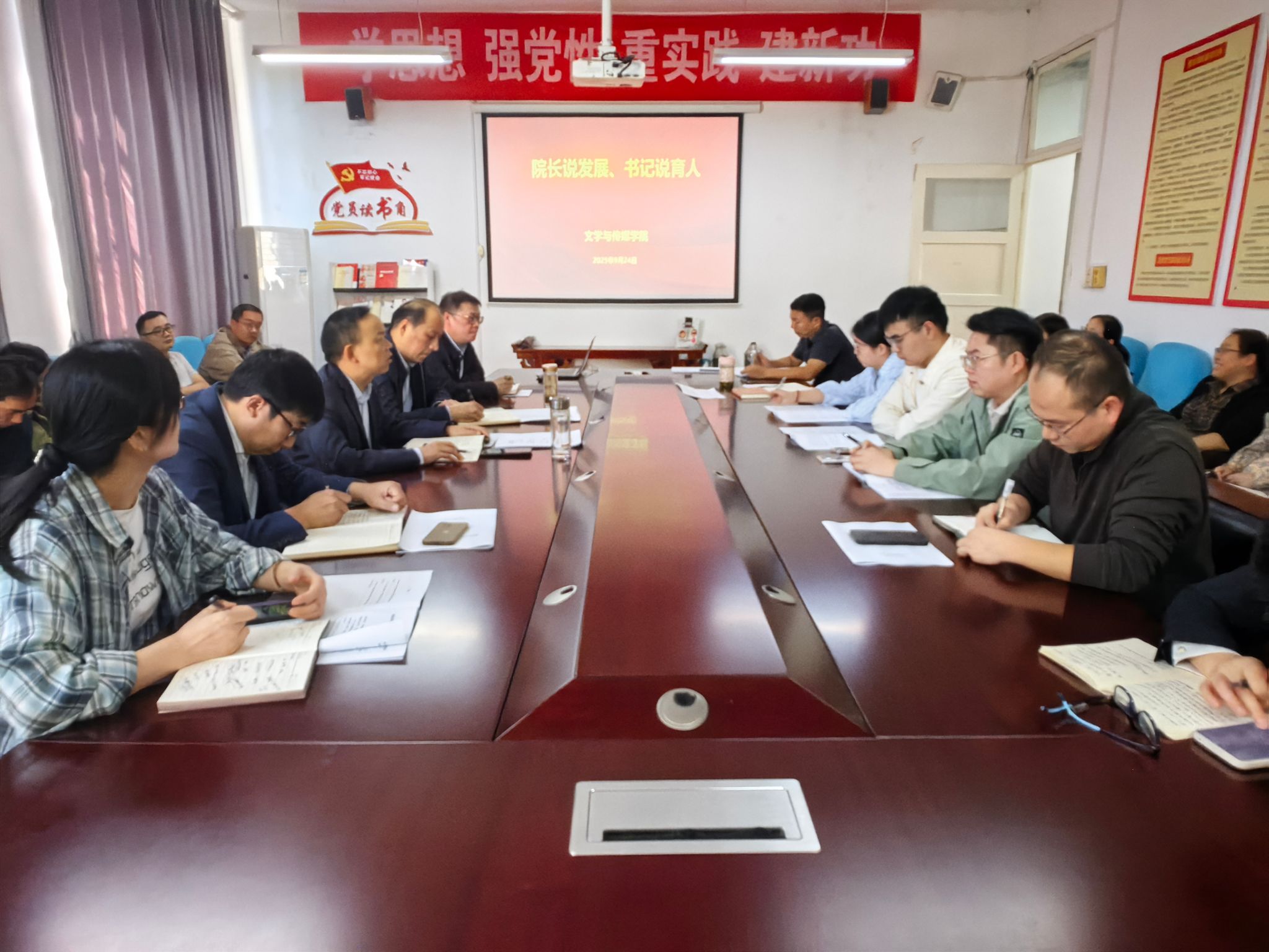 9月24日下午,文学与传媒学院在2307会议室开展“院长说发展、书记说育人”专题活动。院长杨运庚围绕学院教育教学现状和未来发展,党总支副书记(主持工作)任森龙围绕学院育人工作机制和成效做了专题报告,学院全体教职工参加了报告活动。