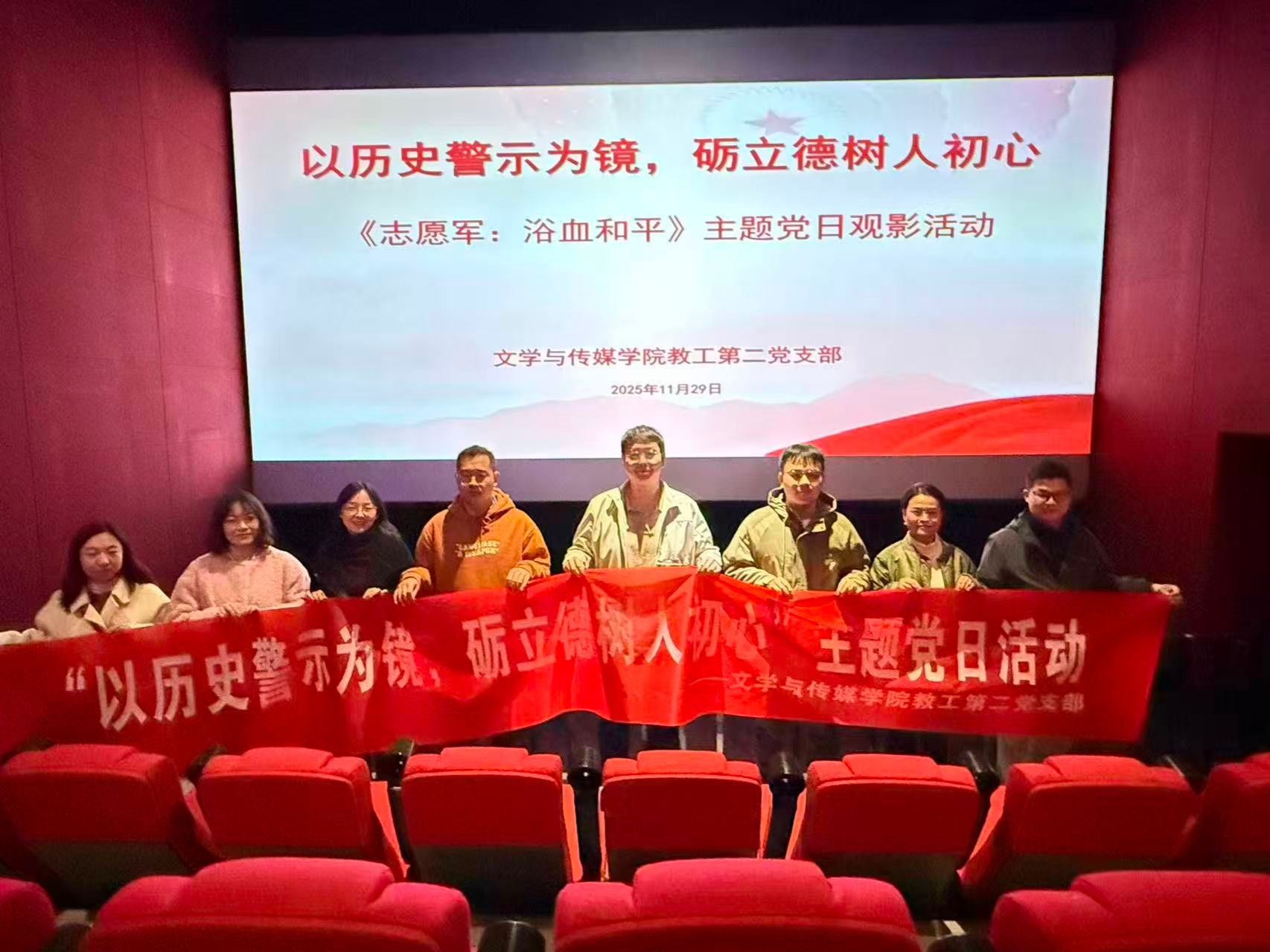 为深入推进党史学习教育,强化师德师风建设,11月29日下午,文学与传媒学院教工第二党支部组织开展了“以历史警示为镜,砥立德树人初心”主题党日活动,集体观看爱国主义影片《志愿军:浴血和平》。支部全体党员参加了此次意义深刻的观影学习活动。