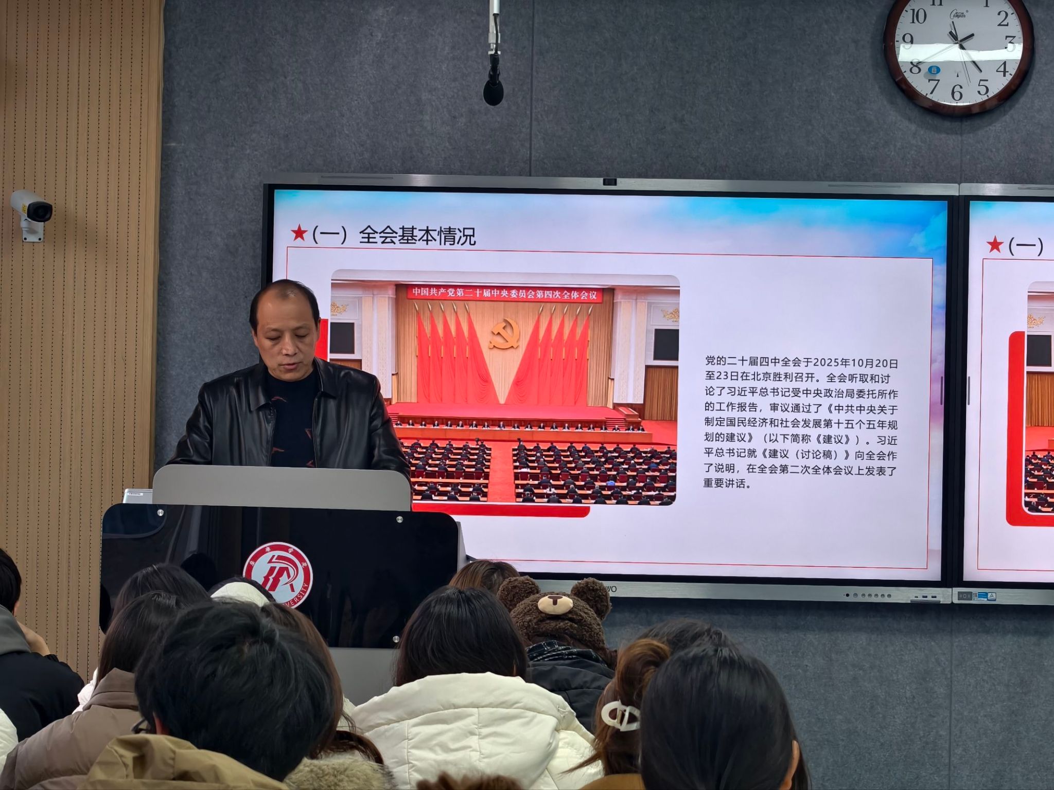 为深入学习贯彻党的二十届四中全会精神,进一步提升学生党员的理论素养与政治自觉,文学与传媒学院学生党支部于12月17日举办专题党课,本次党课以“深学笃行全会精神,实干担当时代重任”为主题,由学院党总支书记任森龙主讲。