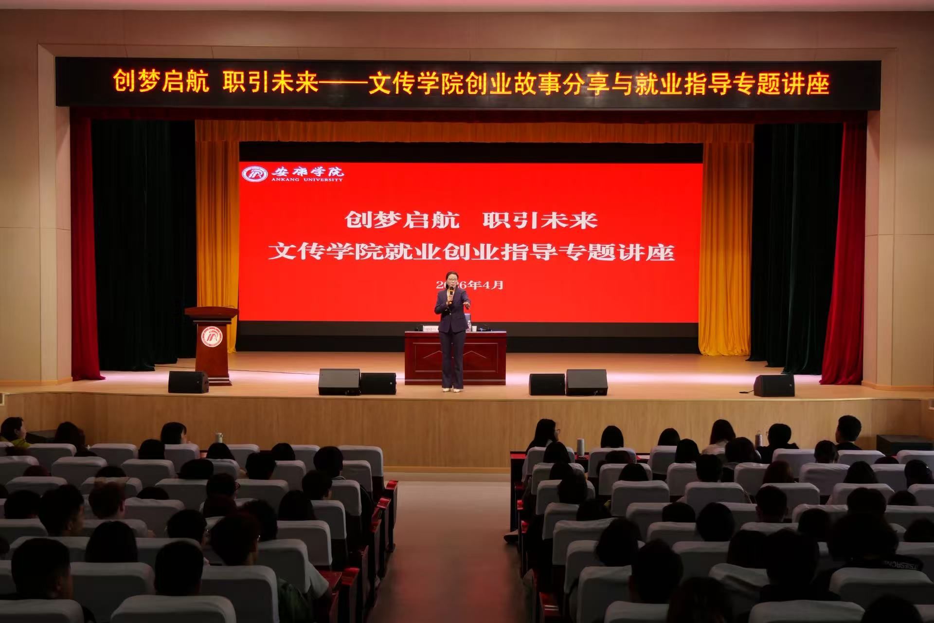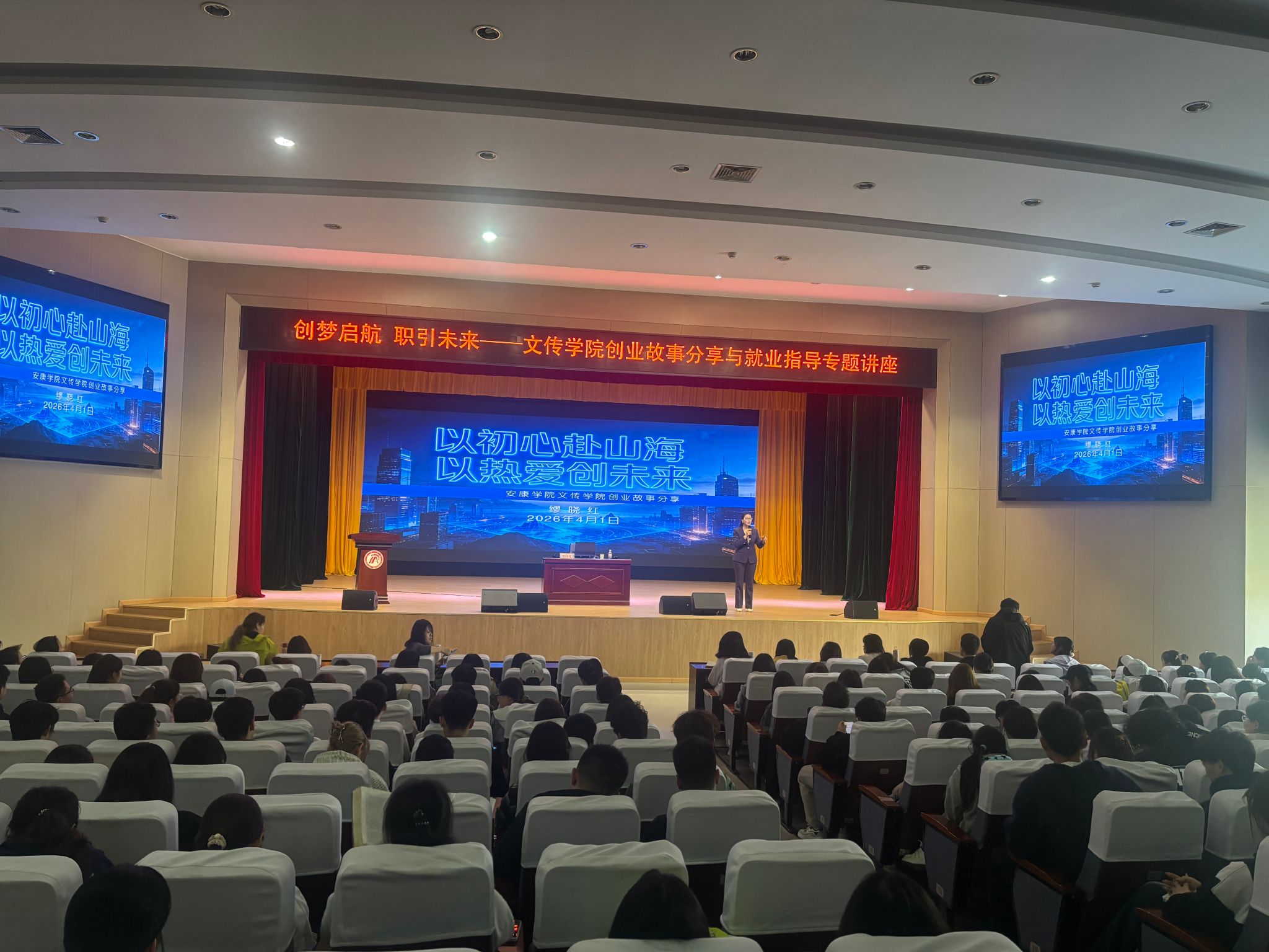 为进一步增强学生职业规划意识与创新创业能力,4月1日下午,文传学院在江南校区大礼堂组织开展创业故事分享与就业创业专题讲座。安康金奇教育创始人缪晓红担任主讲嘉宾,学院党总支副书记侯红艳、辅导员薛涛及2023级、2024级学生近400人参加活动。讲座由侯红艳主持。