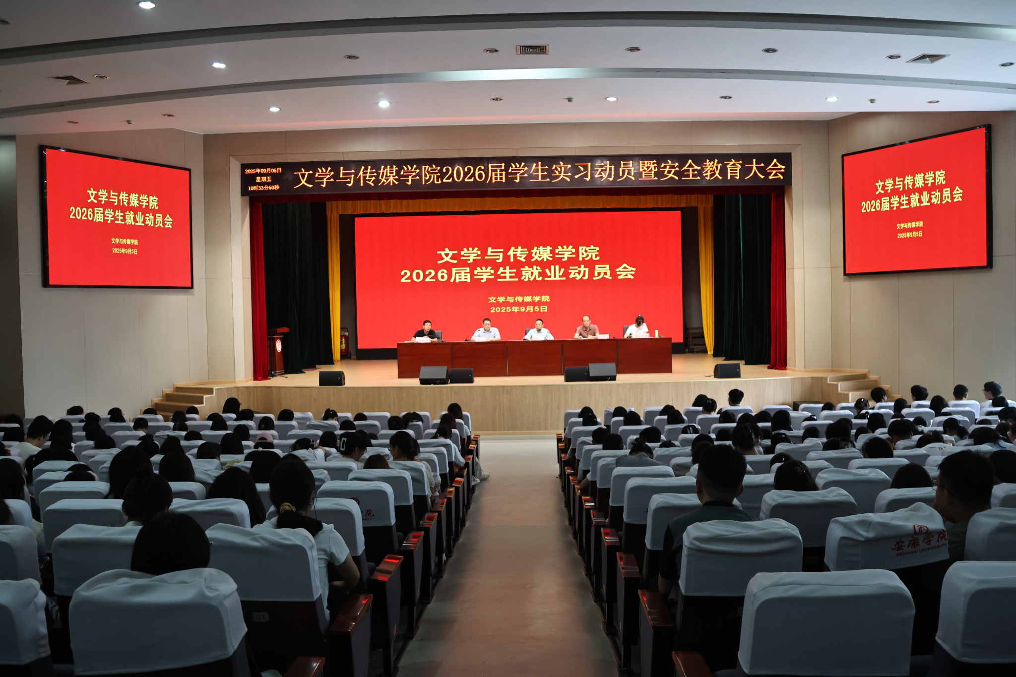 为全面推进2026届毕业生就业工作,助力学生高质量充分就业,文学与传媒学院于9月5日上午在学校大礼堂召开2026届毕业生就业工作启动会。学院领导班子、毕业班辅导员及2026届全体学生参加会议。会议由毕业班辅导员薛涛主持。