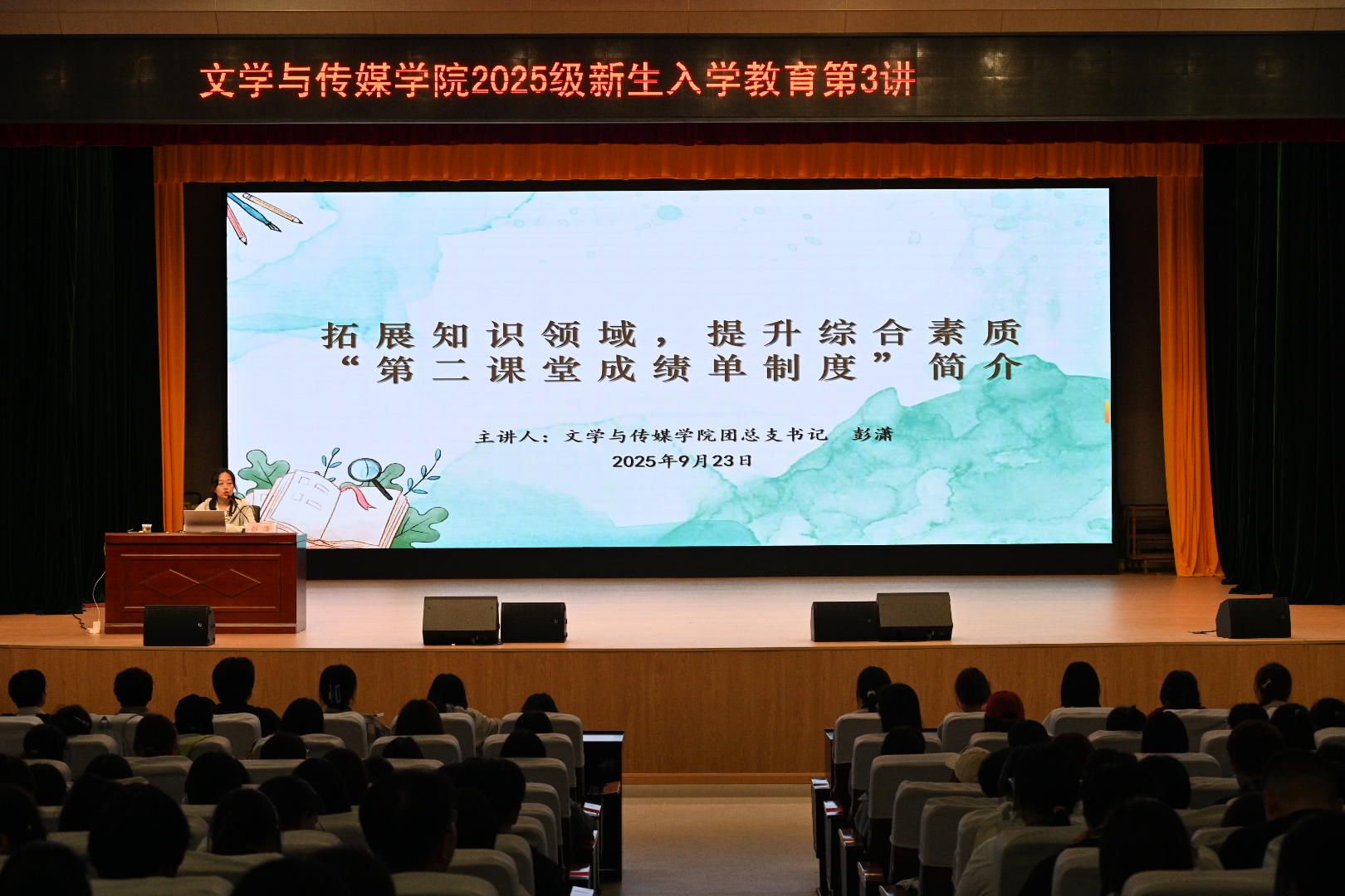 9月23日晚7点,文学与传媒学院在江南校区大礼堂开展新生入学教育第三讲。此次讲座聚焦“第二课堂成绩单制度”,由我院团总支书记彭潇主讲,辅导员喻言主持,全体2025级新生参与。