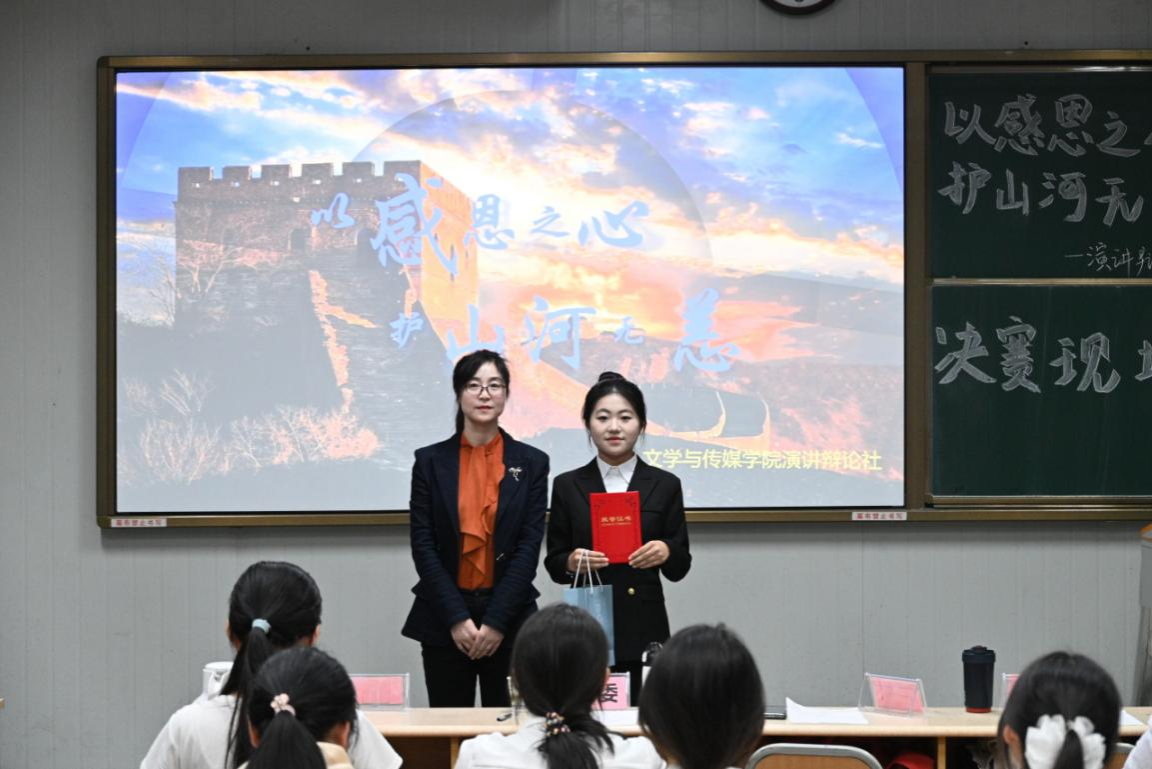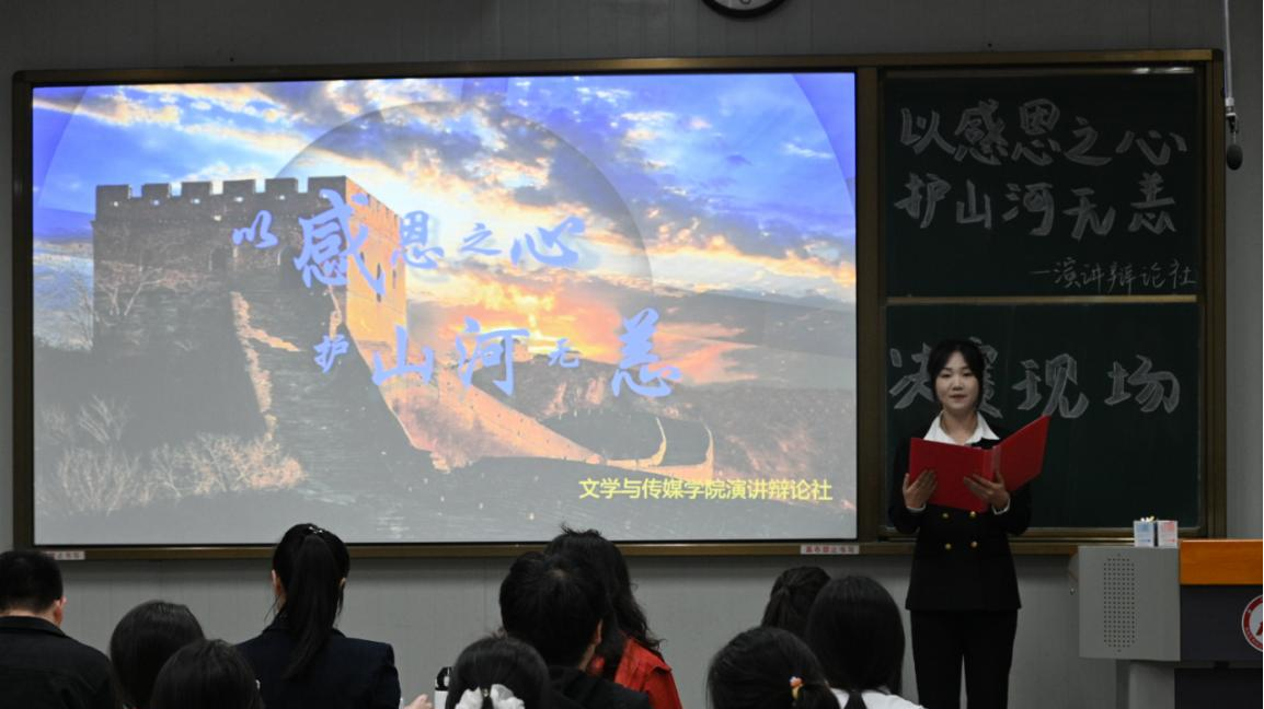 为了充分展现我校大学生的文明素养,引导学生体悟感恩,增强社会责任感,以青春力量守护家国安宁,10月16日下午四时,演讲辩论社在江南校区10号楼1023教室举行“以感恩之心,护山河无恙”主题演讲比赛。文学与传媒学院党总支副书记侯红艳、2024级辅导员刘言军、2025级辅导员喻言、演讲辩论社指导老师余珊担任评委。演讲辩论社袁萌同学主持比赛。