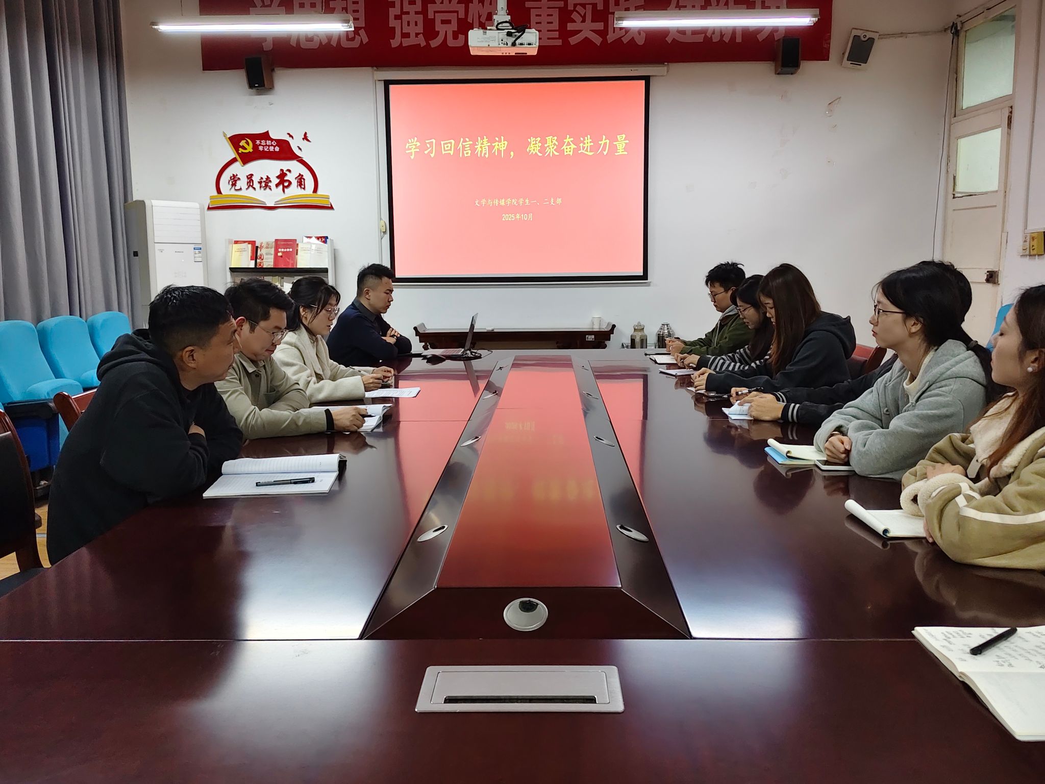 10月28日,文传学院学生一、二党支部联合开展“学习回信精神,凝聚奋进力量”主题党日活动,深入学习习近平总书记给特岗教师的重要回信精神。党总支组织委员薛涛、学生一、二支部书记刘言军、喻言及全体学生党员参加活动。