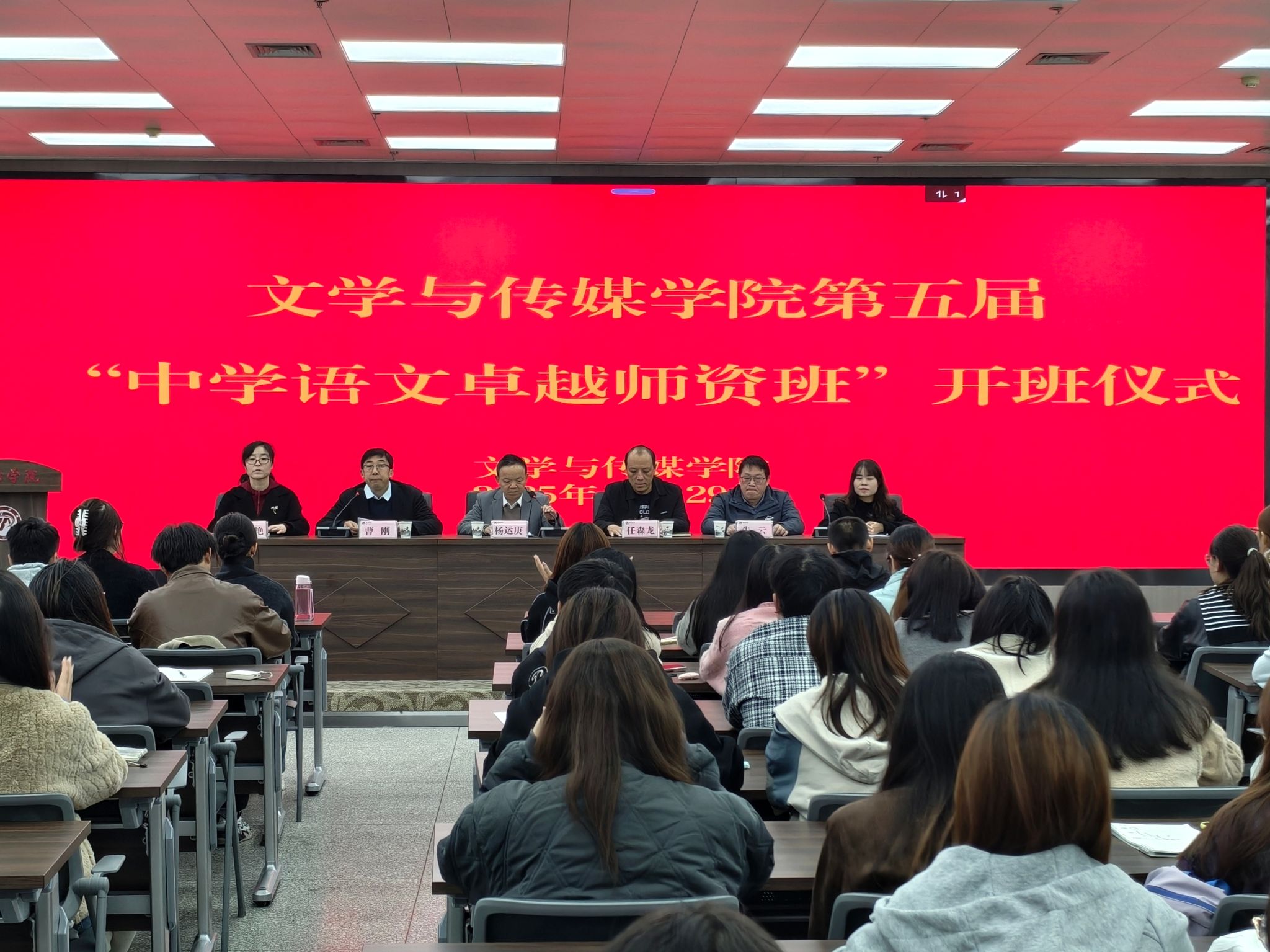为进一步深化人才培养与行业需求的有机衔接,持续提升汉语言文学师范专业育人质量,着力培养具备高尚师德素养、扎实专业功底与实践能力,且能主动适应新时代基础教育发展需求的优秀中学语文教师,10月29日下午,文学与传媒学院在江南校区图书馆六楼报告厅举行第五届“中学语文卓越师资班”开班仪式。学院领导班子全体成员、“中学语文卓越师资班”班主任唐明珍老师及全体学员出席参加了开班仪式。开班仪式由副院长曹刚主持。