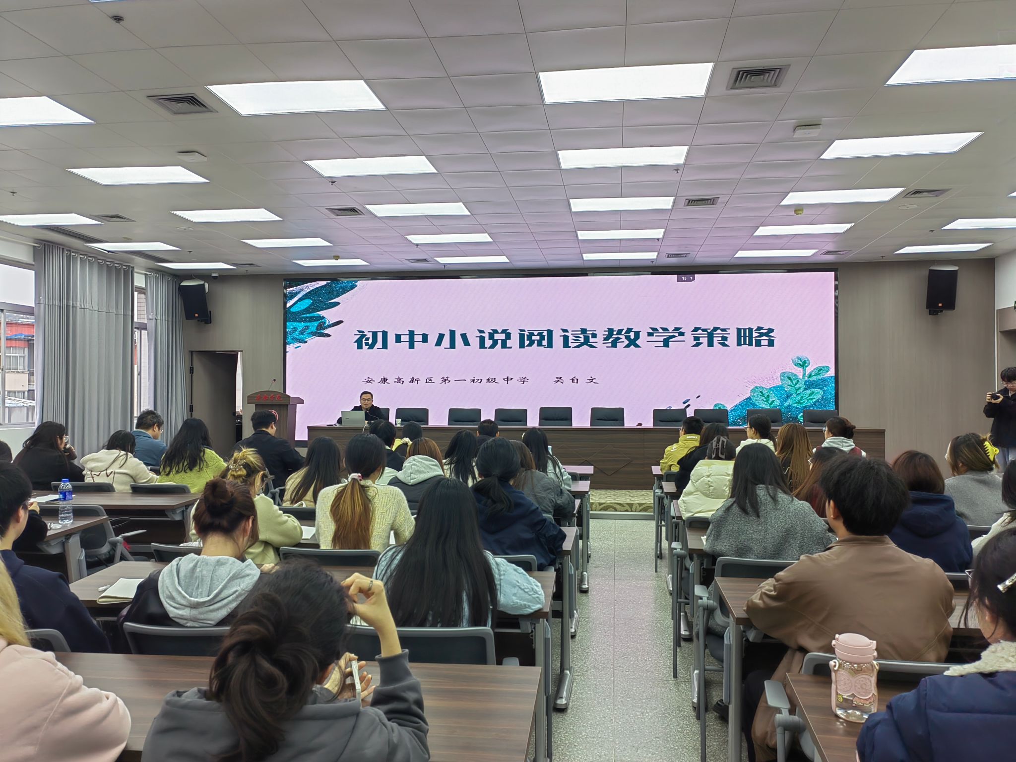 2025年11月12日下午1620分,文学与传媒学院于图书馆六楼报告厅举办第五届“中学语文卓越师资班”第二讲。本次讲座特邀安康市高新区第一初级中学副校长、陕西省优秀教学能手陕西省学科带头人吴自文老师,作题为《初中小说阅读教学策略》的专题分享。班主任唐明珍与师资班全体学员聆听本场讲座