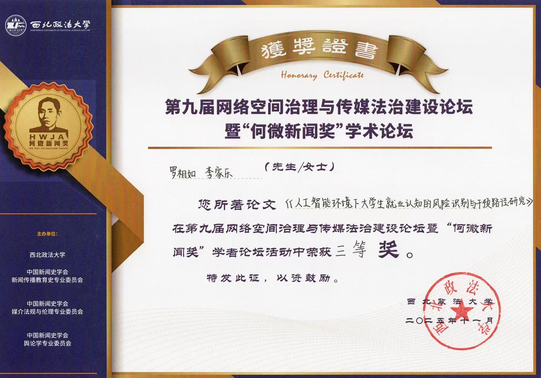 近日,第九届网络空间治理与传媒法治建设论坛暨 “何微新闻奖” 学术论坛在西北政法大学举行。安康学院文学与传媒学院罗相如老师与学生合作完成的论文《人工智能环境下大学生就业认知的风险识别与干预路径研究》,在论坛中荣获学者组三等奖。