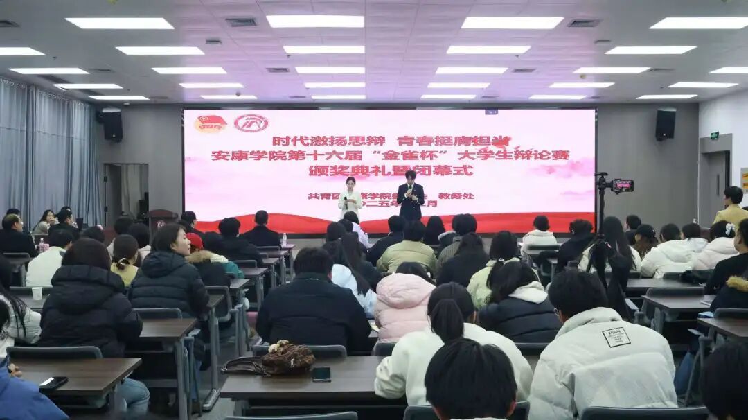 12月12日下午,安康学院第十六届“金雀杯”大学生辩论赛决赛在江南校区图书馆六楼报告厅顺利举行。文传学院代表队凭借扎实的论证和出色的临场发挥,以283分的优异成绩斩获金奖。余珊获评“优秀指导老师”,汉语言文学2024级1班李炫烨荣获“最佳辩手”称号。