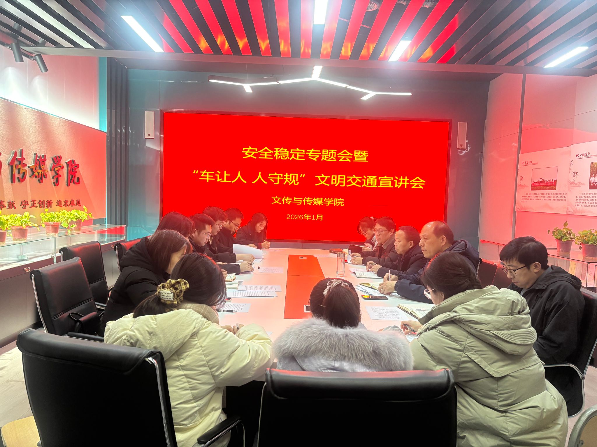 1月8日下午,文学与传媒学院组织召开安全稳定工作专题会议暨文明交通宣讲会。会议由学院党总支书记任森龙主持,学院领导班子成员、各办公室负责人、辅导员及师生代表参加会议。