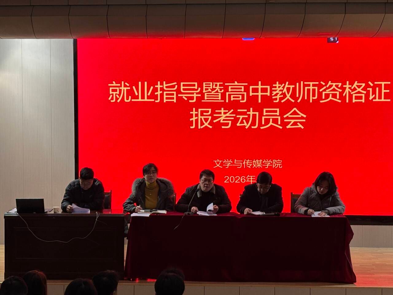 为切实提升毕业生就业核心竞争力,1月9日下午,文学与传媒学院在1号教学楼报告厅组织召开2026届汉语言文学专业就业指导暨高中语文教师资格证报名考试动员会。学院副院长朱云、曹刚,党总支副书记侯红艳,毕业班辅导员及全体2026届汉语言文学专业毕业生参加会议。会议由侯红艳主持。