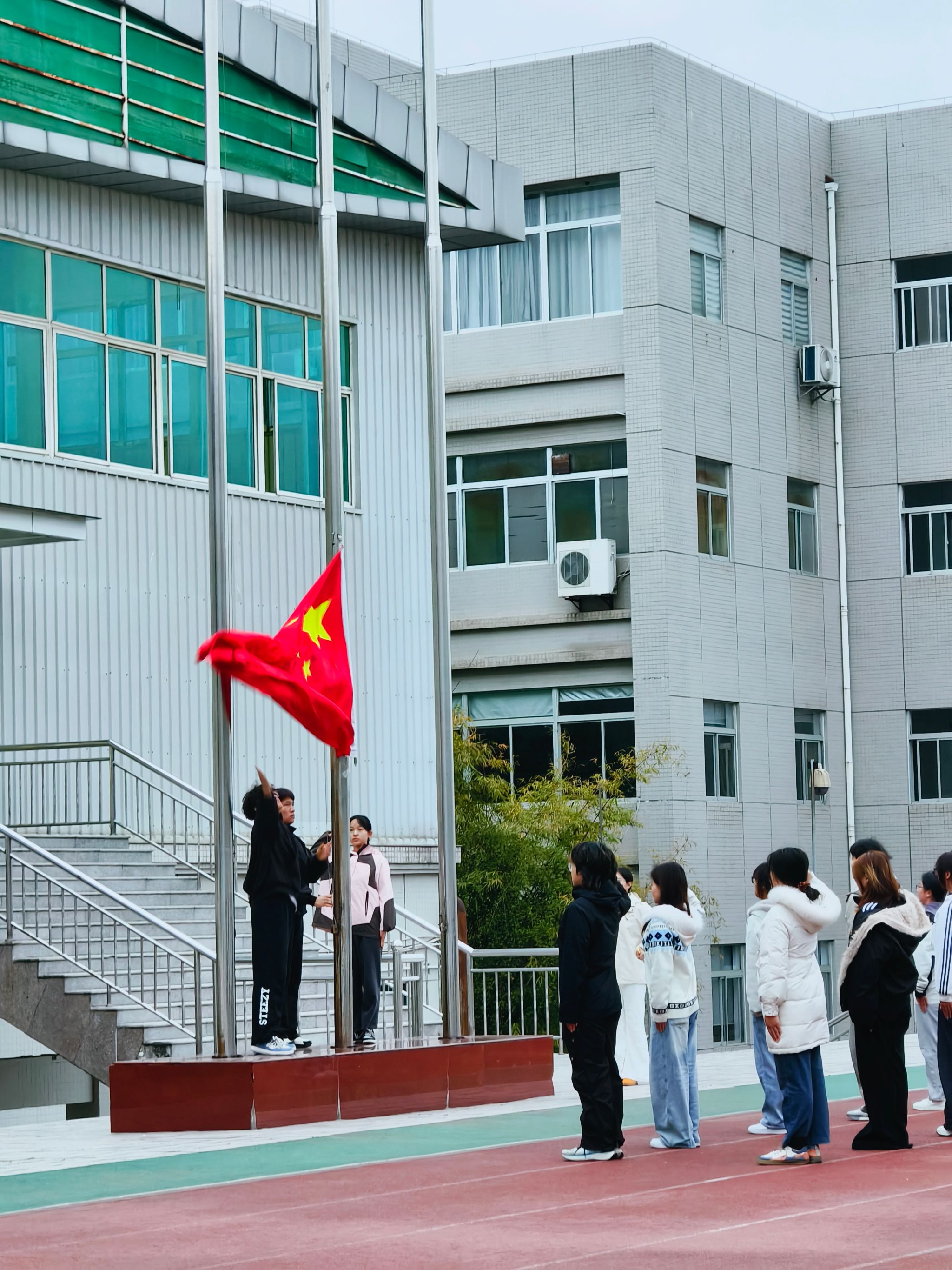 清晨,伴随着第一缕阳光,国旗护卫队迈着整齐有力的步伐护送国旗入场。在庄严的国歌声中,五星红旗冉冉升起,全体师生庄严肃立,行注目礼。