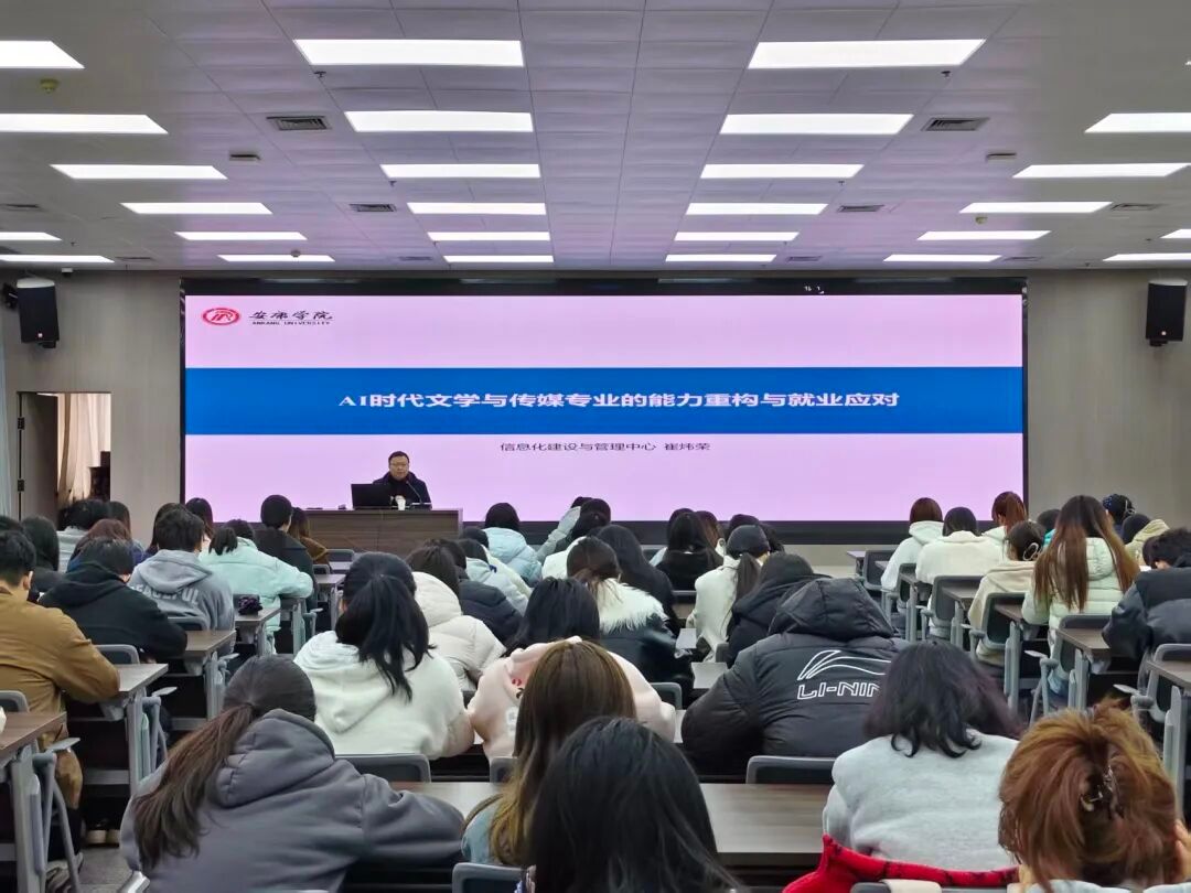 崔炜荣以“AI时代文学与传媒专业的能力重构和就业应对”为题,从“AI的三次变化演进”“专业岗位的重构与升级”“核心能力的升值与贬值”“毕业生应对策略”四个维度,为同学们进行了深度解析与实战指导。针对人工智能逐步渗透内容生产全环节的行业现状,他总结了可替代性工作的共同特征,剖析文字采编、视频编导、内容策划等专业岗位的发展变化,并鼓励同学们充分发挥“人”的主体性优势,善用AI工具放大自身专业价值,重点培养高判断、高洞察、高审美、高整合的核心竞争力,实现与AI的协同发展。